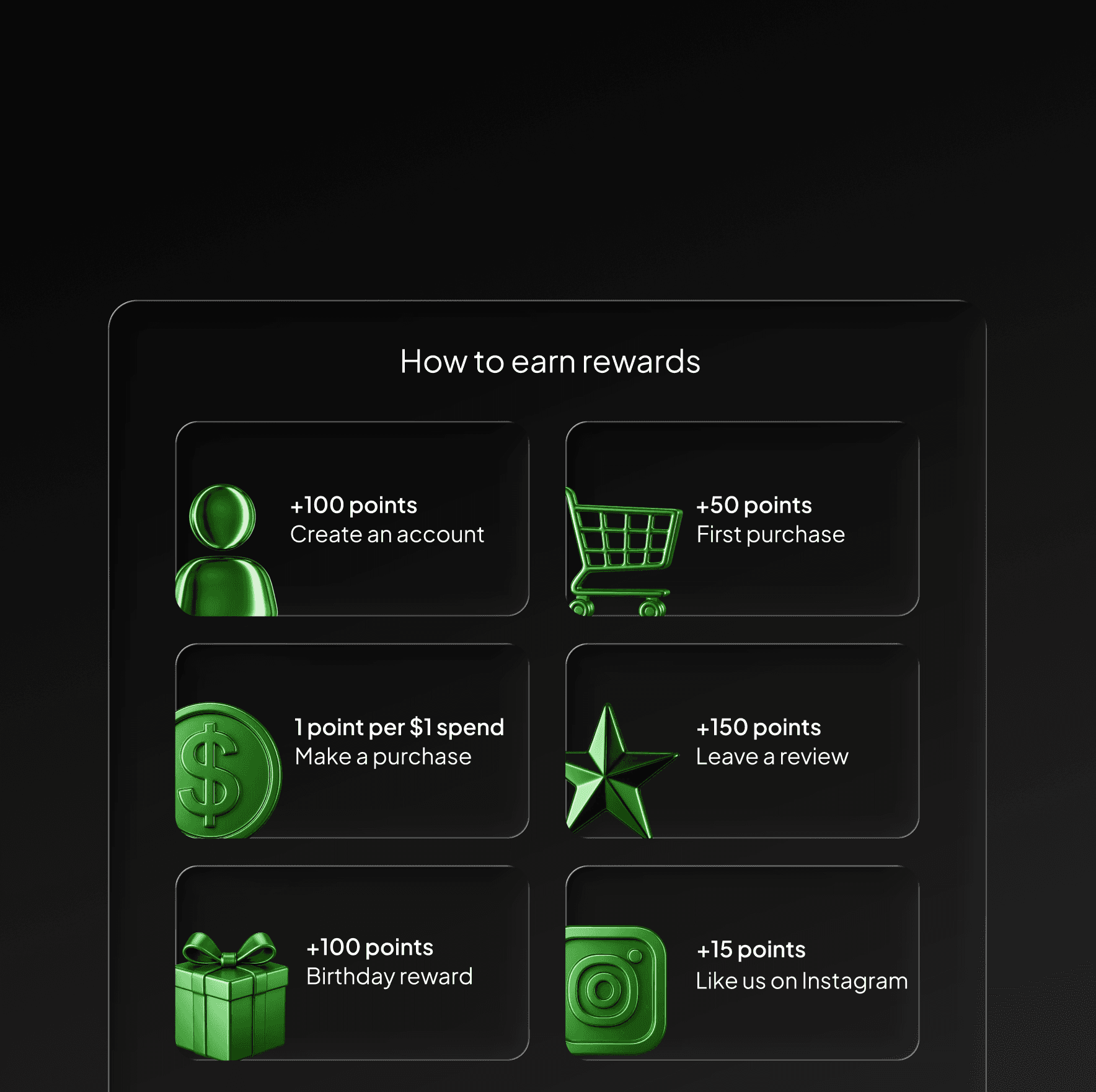 Customers earn rewards for actions that matter: purchases, referrals, reviews, or social engagement.
